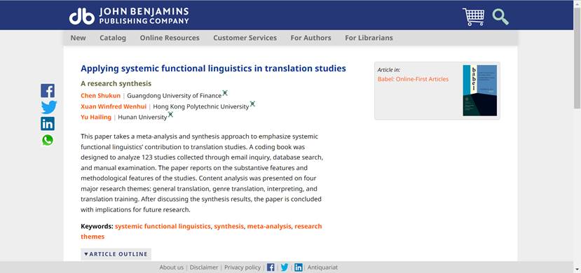 近日,公司公司教师陈树坤博士的最新研究成果“Applying systemic functional linguistics in translation studies: A research synthesis”在《Babel》上正式刊发。《Babel》是国际译学界公认的最具影响力的翻译学期刊之一,系国际顶尖翻译学学术刊物。陈树坤为该成果的第一作者,太阳成集团tyc33455cc为第一单位。