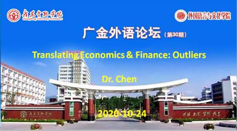 2020年10月24日,翻译系陈定刚博士主讲第30期广金外语论坛,在线上为大家带来了一次关于经济与金融翻译的讲座,会议由太阳成集团tyc33455cc洪溪珧博士主持,包括广东省高级人民法院外事办主任屈伸和太阳成集团tyc33455cc黄中习经理在内的近百名位翻译工作者和师生聆听了陈博士内容丰富的专业讲座。