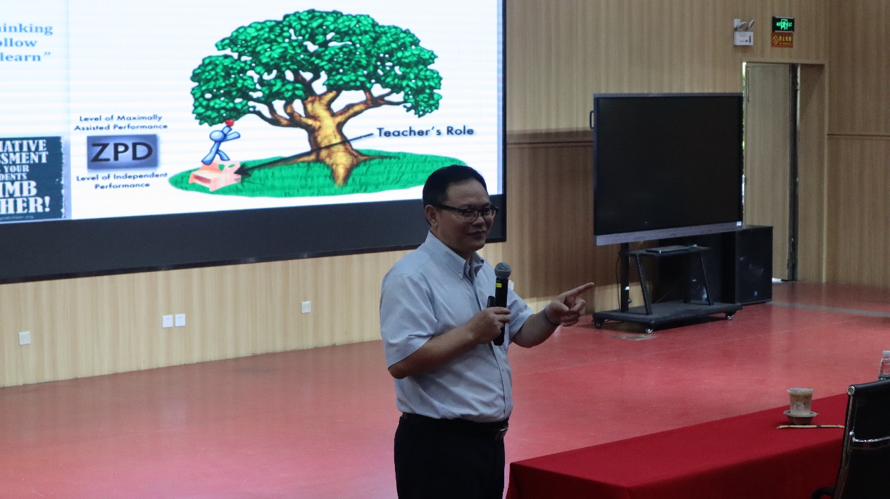 随后,刘建达教授围绕形成性评价理论和基于形成性评价的大学外语数字教学两方面展开讲学。首先,刘建达教授借鉴中共中央国务院印发的《深化新时代教育评价改革总体方案》,提出当代教育评价改革要改进结果评价、强化过程评价、探索增值评价和健全综合评价,完善过程性考核与结果性考核有机结合的学业考评制度。刘建达教授介绍了国家外语能力测评体系,着重分析中国外语能力等级量表、外语考试的整合和开发、高考外语改革、中国外语考试质量标准和形成性评价与终结性评价相结合的体系。