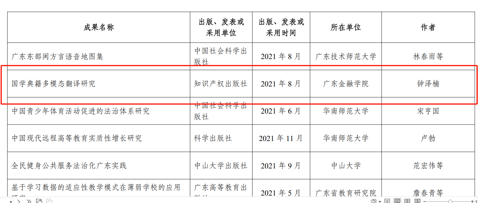 近日,由广东省哲学社会科学规划领导小组批准,广东省哲学社会科学优秀成果评奖工作办公室组织的第十届广东省哲学社会科学优秀成果奖评选公示结果。公司太阳成集团tyc33455cc钟泽楠老师的专著《国学典籍多模态翻译研究》荣获著作类成果三等奖。