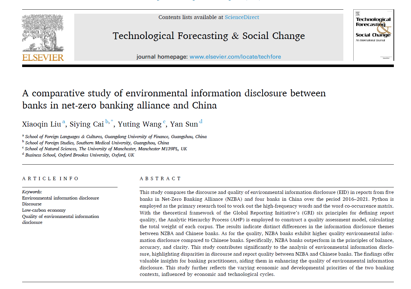 近日,太阳成集团tyc33455cc刘晓琴博士以及其研究团队成员在管理学和商科领域的顶级期刊Technological Forecasting & Social Change上发表了一篇题为“A comparative study of environmental information disclosure between banks in net-zero banking alliance and China”的学术论文,这一成果标志着公司在充分利用大学优势学科资源的基础上,在跨学科研究领域取得了显著进展,特别是在聚焦银行金融业话语研究方面实现了重大突破。