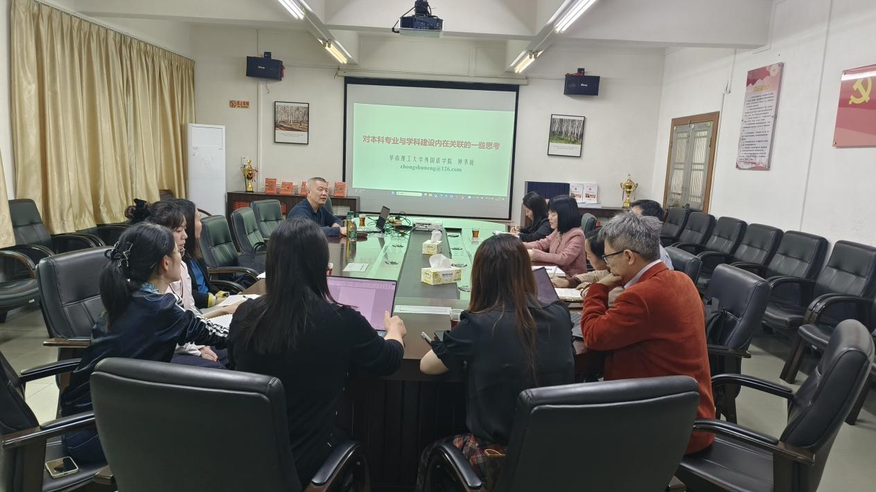 4月7日,华南理工大学外国语公司钟书能教授应邀来公司座谈,围绕“对本科专业与团队建设内在关联的一些思考”这一主题进行学术交流。本次座谈会由涂兵兰经理主持,洪溪珧、陈树坤、甘容辉副经理,各系主任及科研骨干教师共同参与。
