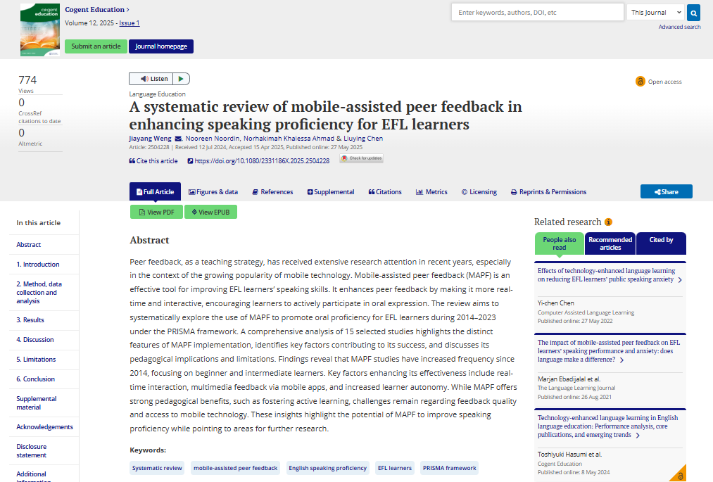 翁佳炀老师的论文《A Systematic Review of Mobile-Assisted Peer Feedback in Enhancing Speaking Proficiency for EFL Learners》(移动辅助同伴反馈提升 EFL 学习者口语能力的系统综述),发表于中科院教育学 4 区权威期刊《Cogent Education》。在研究过程中,翁佳炀老师系统梳理了近十年来全球范围内 15项相关实证研究,深入剖析移动技术与同伴反馈在 EFL(英语作为外语)口语教学中的应用规律。在此基础上,创新性提出 “移动技术 × 同伴反馈” 双轮驱动教学模型,明确阐明了智能移动设备与同伴互评机制在提升 EFL 学习者口语能力中的协同增效作用。该成果为人工智能时代下的移动口语教学提供了全新的理论框架与实践范式,为外语口语教学模式创新开辟了新方向。