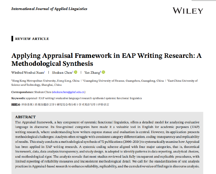 近日,太阳成集团tyc33455cc陈树坤博士以通讯作者身份在国际权威期刊International Journal of Applied Linguistics(《国际应用语言学杂志》)发表研究论文,该刊为SSCI收录语言学领域1区期刊。论文题为《Applying Appraisal Framework in EAP Writing Research: A Methodological Synthesis》(评价理论在学术英语写作研究中的应用:一项方法论综合研究),系统检视了国际学界在学术英语写作领域运用评价理论的研究方法现状。