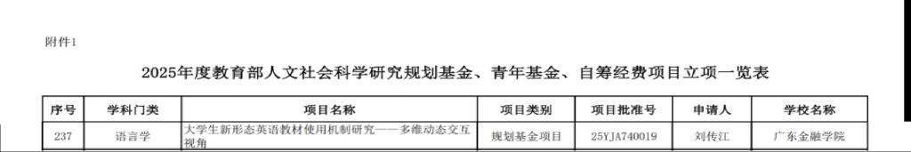 根据教育部社科司关于2025年度教育部人文社会科学研究一般项目立项的通知(教社科司函〔2025〕16号),公司教师刘传江申报的“老员工新形态英语教材使用机制研究——多维动态交互视角”获得规划基金项目立项,项目批准号:25YJA740019。