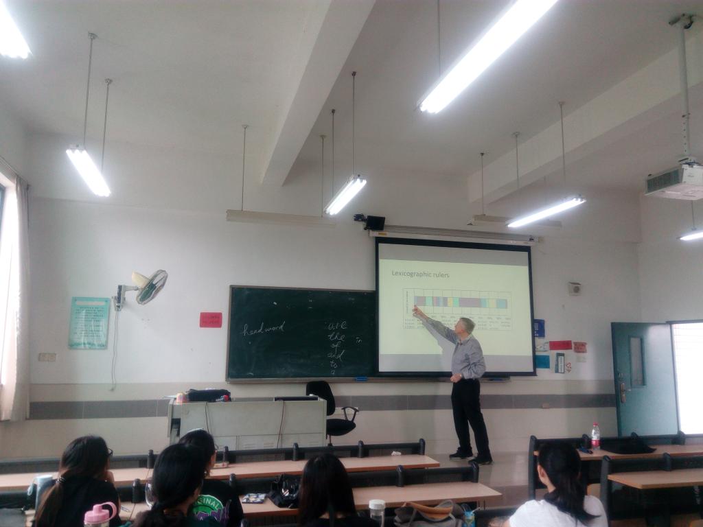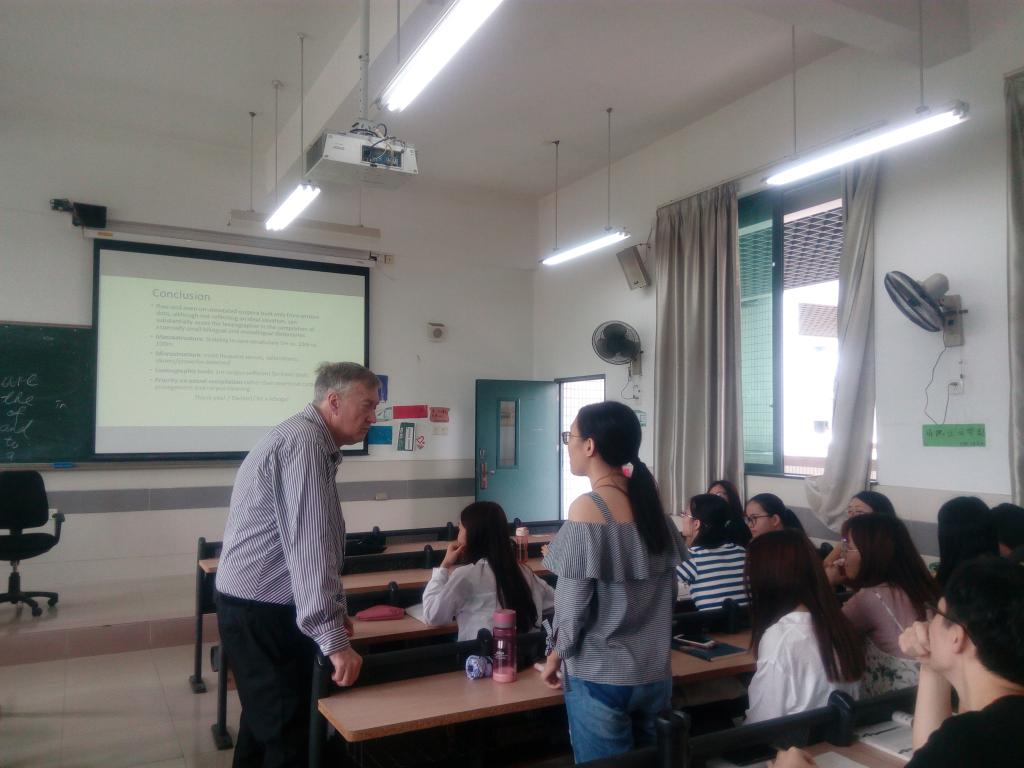 2018年6月12-14日,在与​公司教师进行“海外名师讲座”学术交流之余,公司还安排词典学名家、南非比勒陀利亚大学(University of Pretoria)语言学Prinsloo教授分别到公司1515951、1515952和1515953三个班的“英语论文写作”课上,让公司英语专业老员工在教室里,面对面与海外名师交流;让老师给员工答疑解惑。