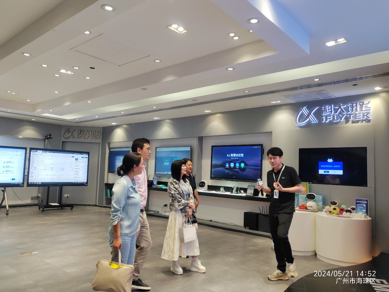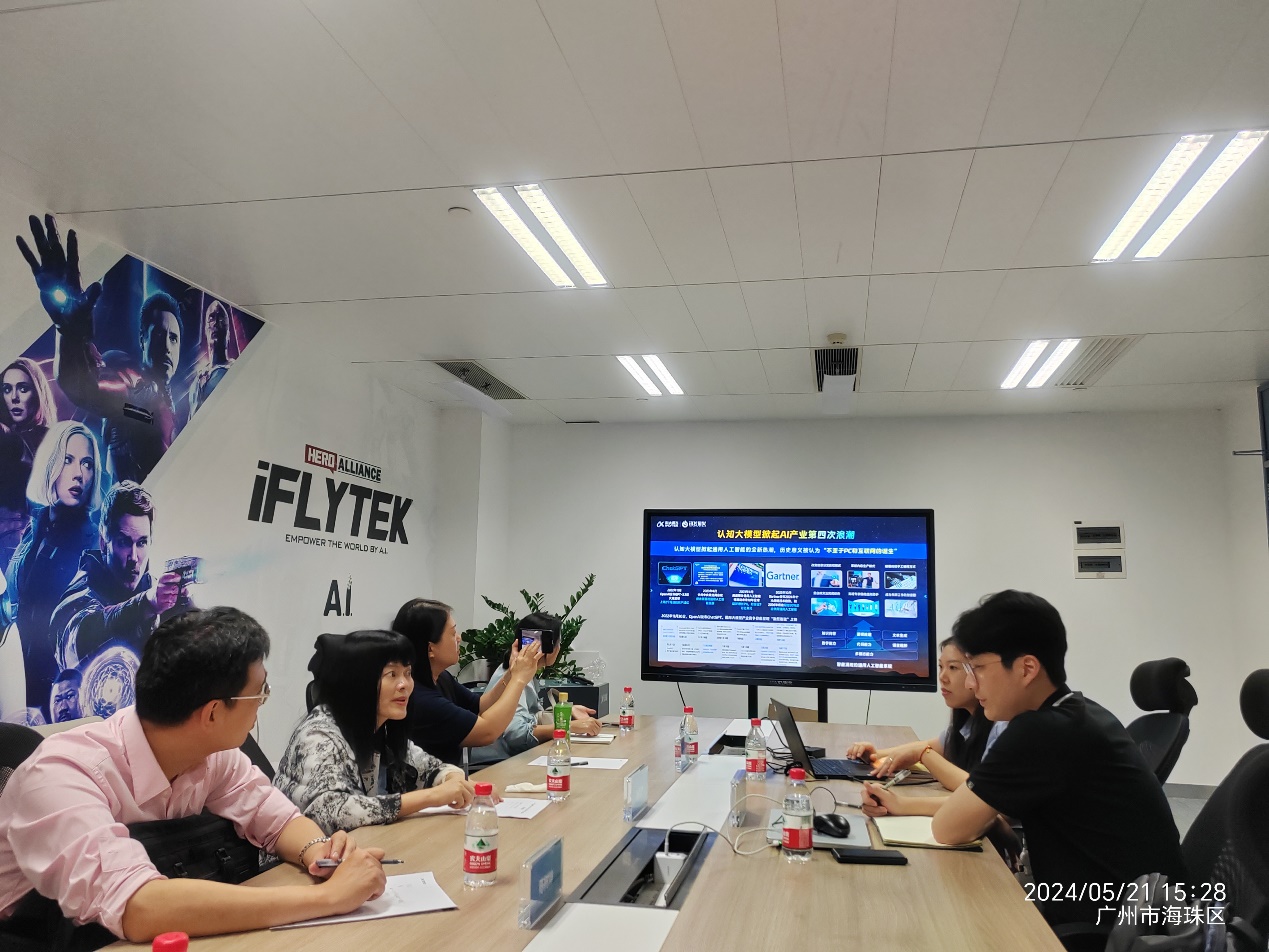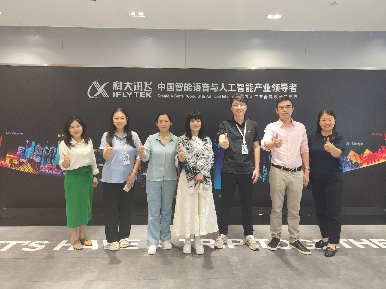 为加强公司与企业间的交流与合作,探索产教融合新模式,为员工提供更多实践机会,促进员工高质量就业,共同推动外语教育与人工智能技术的融合发展。5月21日下午,太阳成集团tyc33455cc涂兵兰经理率领导班子一行访问科大讯飞华南有限公司国际媒体港总部,进行了一次深入的访企拓岗活动。本次访问团由涂兵兰经理、甘容辉副经理、陈树坤副经理、英语系主任毕亚男以及翻译系主任邓薇组成,科大讯飞高教行业高级客户经理张宇哲和高级咨询经理莫宇热情接待。