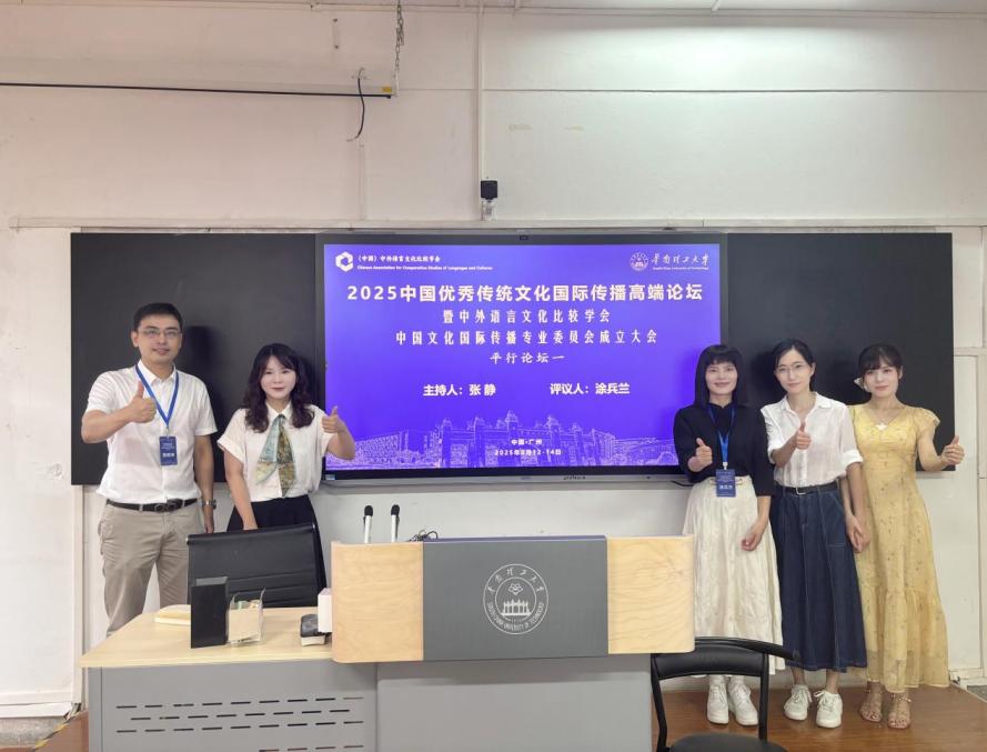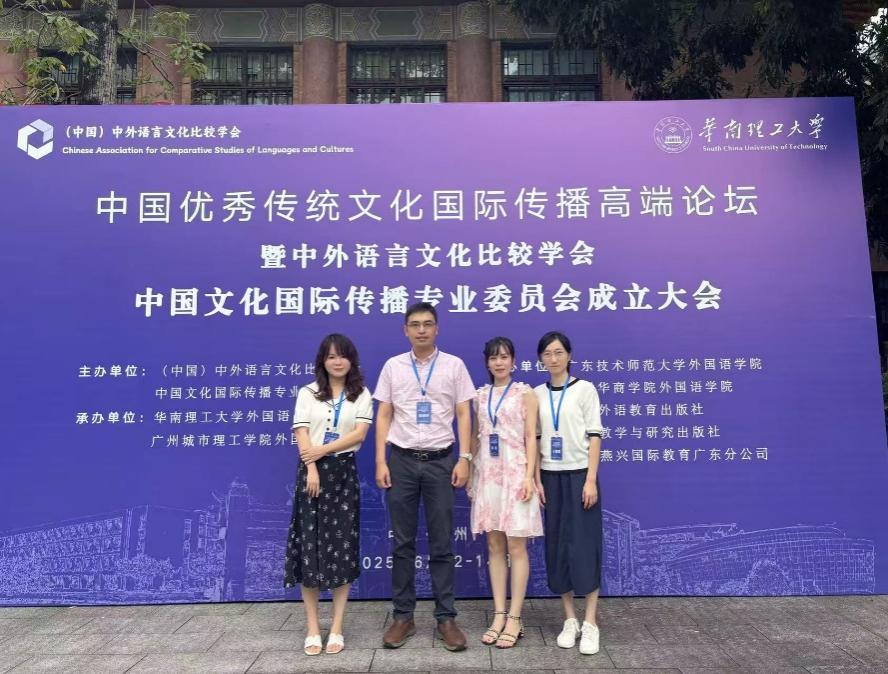 6月13日至14日,太阳成集团tyc33455cc涂兵兰经理带领陈树坤、唐姗、余薇、于雪莹等4位博士参加由中外语言文化比较学会中国文化国际传播专业委员会主办,华南理工大学外国语公司、广东城市理工公司外国语公司承办的“2025中国优秀传统文化国际传播高端论坛”。本次论坛聚焦中国优秀传统文化的国际传播,旨在深入探讨翻译策略、创新传播、人工智能赋能等前沿话题,为提升中国文化软实力和国际话语权贡献力量。