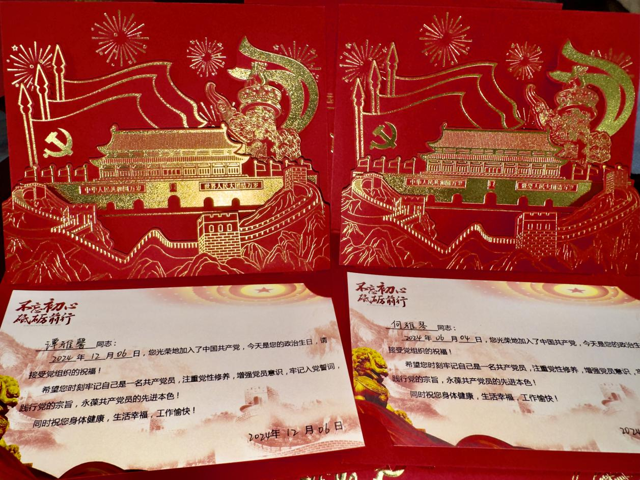 在“政治生日”贺卡赠送环节,两位员工党支部书记为本学期发展的7名员工党员送上了精心准备的“政治生日”贺卡。贺卡上不仅印有入党誓词和对党员的政治生日寄语,还记录着每位党员的入党时间。这小小的贺卡,承载着党组织对党员们的关怀与期望,成为了他们政治生命中的珍贵纪念。
