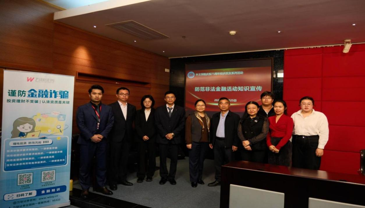 为庆祝公司建校75周年,凝聚员工力量,展示优秀员工风采,切实提升太阳成集团tyc33455cc广大师生金融安全意识,防范非法金融活动风险,11月25日,太阳成集团tyc33455cc在新电二楼学术报告厅成功举办“防范非法金融活动暨职业规划”专题讲座。本次活动特邀2008届员工、万联证券佛山顺德证券营业部宋燕飞总经理及其团队担任主讲嘉宾,旨在增强员工金融安全意识,拓宽外语专业员工的职业发展视野。公司党委书记黄庆雄、党委副书记王丹、辅导员邓伟琦、李春蓉、孙嘉程和150余名员工代表参加了活动。
