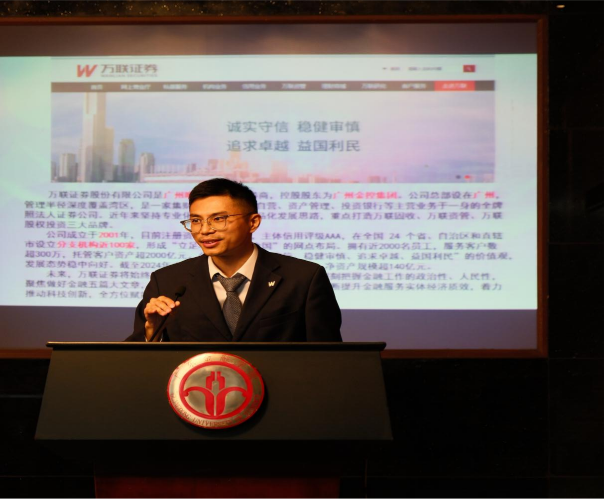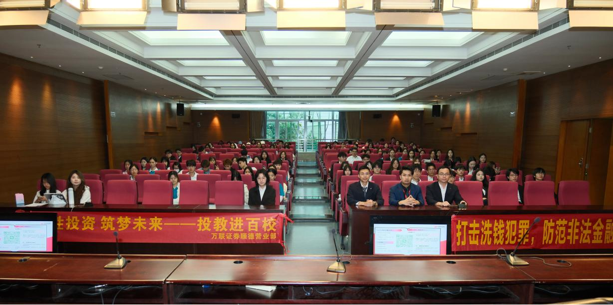 随后,万联证券资深财务顾问钱逸结合自身从外语专业毕业生转型为金融行业从业者的成长经历,为同学们带来一堂生动实用的职业规划课,她分享了外语人才在金融领域的发展优势,鼓励同学们发挥语言特长,主动拓展金融、经济等相关知识,打造“英语+金融”的复合型能力结构。她的讲述贴近实际、富有感染力,激发了在场同学对未来职业发展的深入思考。