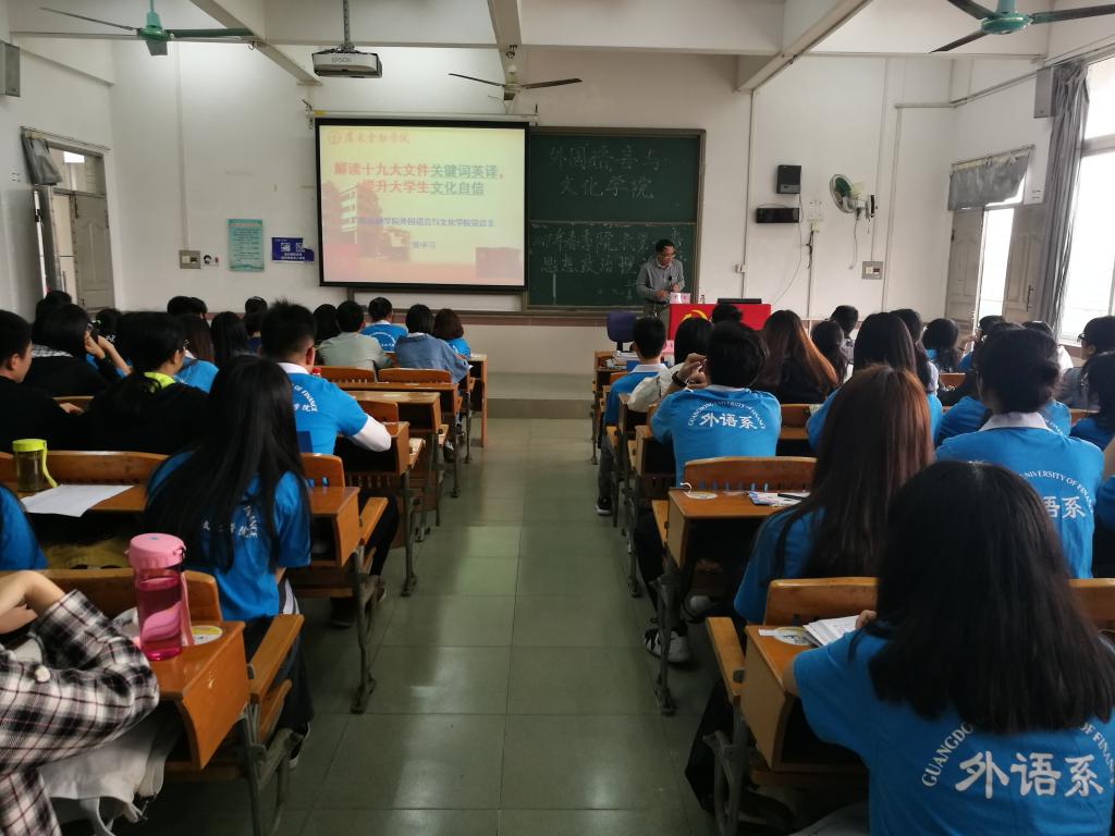 课堂上,黄晓莉书记以“坚定理想信念,践行社会主义核心价值观”为主题开讲,她通过阐述党员先进性的含义,带领同学们感知其重要性,在践行社会主义核心价值观的同时,要发挥党员的先进性和先锋模范作用。黄中习经理则围绕“解读十九大文件关键词英译,提升大学文化自信”开讲,让同学们在愉悦的氛围中加深了对十九大文件的认识、明白到自身努力的必要性,告诉大家应当关注国家社会的发展。