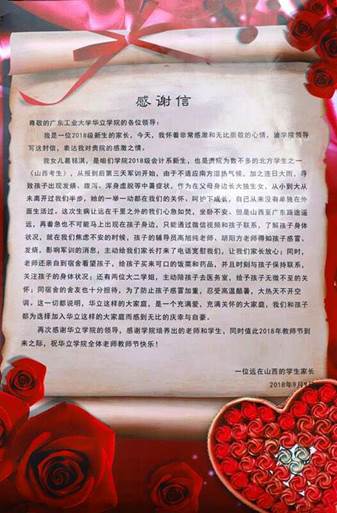 师姐:一开始新生来的时候我去看过他们,她一切都挺好的。军训的时候,因为她本来是外地的同学,不太适应广东的气候饮食各方面的,第一天她跟我说她肚子不舒服,一直跑厕所,我就跟她说去看校医。我下午一直跟她保持联系,不放心就去宿舍看她,她跟我说好很多了。后面她肚子好了,但还很虚弱,我就让她在旁边休息。她爸妈不放心就赶了过来。起初是我主动打电话给她妈妈,一是为了保证员工的安全,二是宽慰他们,免得他们过于担忧。自这件事之后,她的爸妈也常打电话给我,我们一直保持联系,可以说是成了好朋友呢,哈哈。说实话,我觉得我只是做了一个辅导员该做的事情,收到感谢信我挺惊讶的。