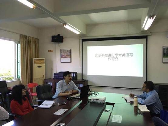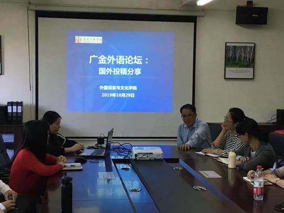2019年10月29日下午,太阳成集团tyc33455cc举行“广金外语论坛”,邀请刘晓琴、钟泽楠和陈树坤三位在SSCI刊物发表过论文的教师分享英文学术论文写作和国外投稿经验,系部主任、青年博士以及新进教师等20余人参加了本次论坛。