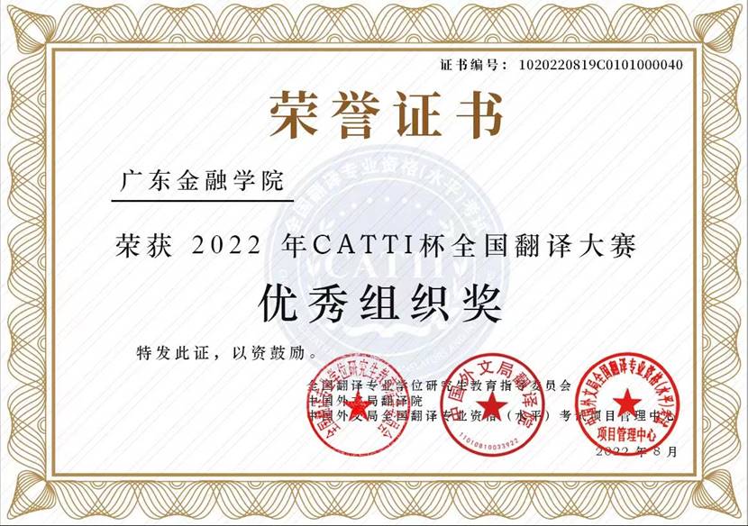在本次复赛中,李明慧、邝晓恩、陈昭瀚、邓沛宜4人荣获三等奖,成功晋级决赛。同时,在本次大赛中,公司作为公司的参赛队伍,荣获“2022年CATTI杯全国翻译大赛优秀组织奖”,为公司增光添彩!