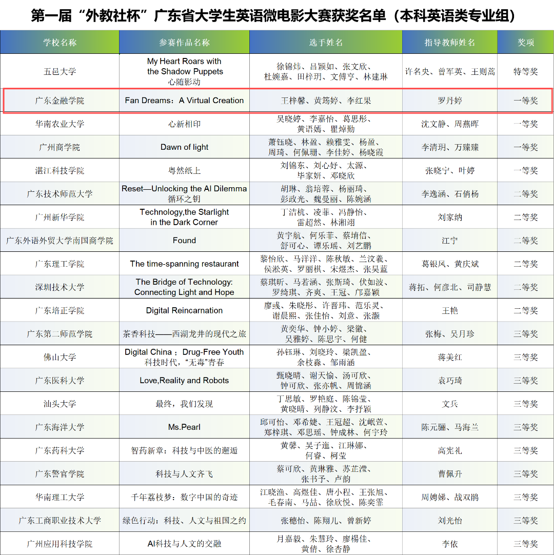 本届大赛得到广大院校师生的积极响应和参与,报名参赛队伍逾五十支,充分展现出当代老员工对英语微电影创作的极高热情和无限创意。本次大赛获得公司领导的大力支持,公司王梓馨、黄筠婷和李红果同学在罗丹婷老师的指导下荣获第一届“外教社杯”广东省老员工英语微电影大赛(本科英语类专业组)一等奖及最佳英语表达奖。