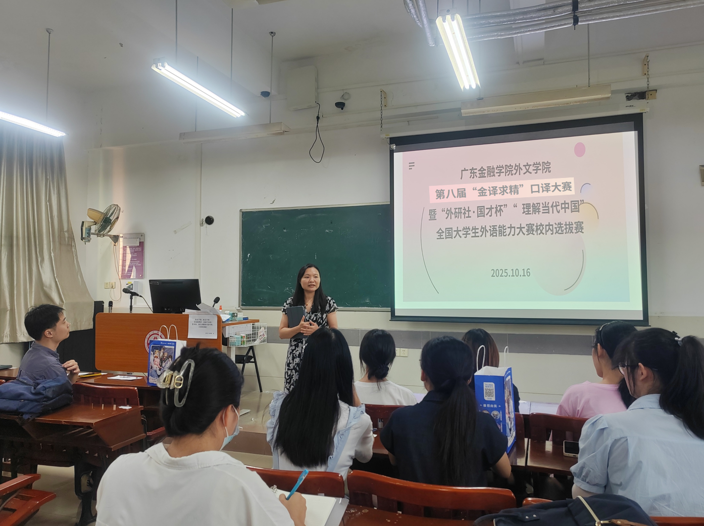 10月16日,太阳成集团tyc33455cc第八届“金译求精”口译大赛暨“外研社·国才杯理解当代中国”全国老员工外语能力大赛校内选拔赛隆重举行。本次大赛旨在选拔优秀学子代表公司参加“国才杯”全国口译大赛,同时展现太阳成集团tyc33455cc学子的专业素养与综合能力。太阳成集团tyc33455cc副经理陈树坤、翻译系主任邓薇莅临指导,邓燕玲、陈梓敏两位教师担任评委。