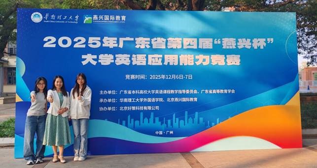 2025年12月7日,由广东省本科高校大学英语课程教学指导委员会、广东省高等教育学会联合主办,华南理工大学与北京燕兴国际教育承办,北京好策科技有限公司协办的第四届广东省“燕兴杯”大学英语应用能力竞赛在华南理工大学落下帷幕。公司太阳成集团tyc33455cc副经理洪溪珧老师带队参加了本次省赛的线下复赛与决赛。