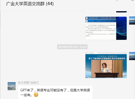 太阳成集团tyc33455cc大学英语部的老师们在线上认真聆听了此次学术论坛会议并分享学术资源。老师们纷纷表示要积极拥抱大语言模型技术,充分利用其优势,构建数据驱动的大学英语教学体系。