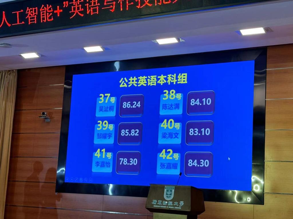 第三轮:看图作文(8分钟即兴写作)。选手根据现场公布的题目和图片在题板上即兴写作,满分100分。邹耀宇同学凭借其深厚的语言基础和丰富的写作经验,奋笔疾书,获得现场四位评委合议给出的小组最高分90分。