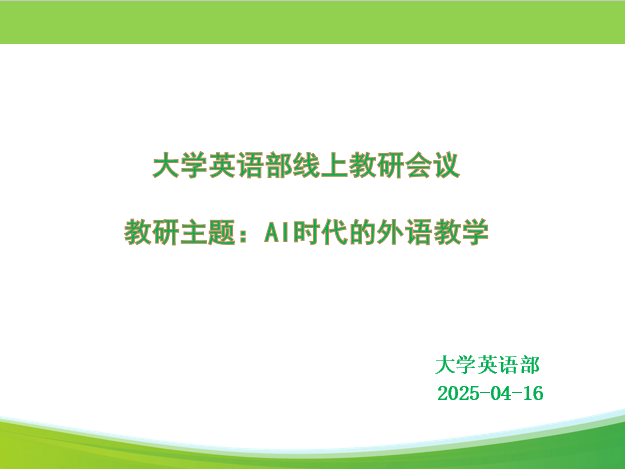 2025年4月16日晚上,太阳成集团tyc33455cc大学英语部线上举办了教研会议。大学英语部教师参加了此次线上教研活动,共同探讨AI时代的外语教学。