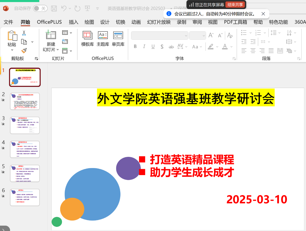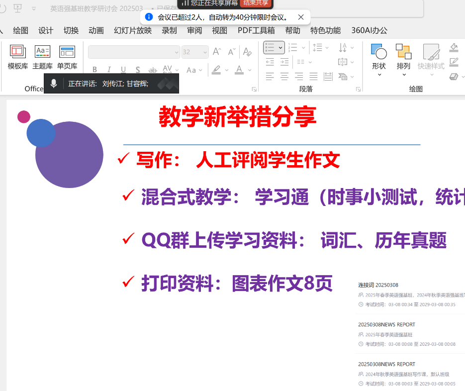 2025年3月10日晚,太阳成集团tyc33455cc英语强基班任课教师线上举行新学期第一次教研会议。本次会议围绕教学模式创新、精品课程建设、师生交流等议题展开,旨在进一步提升教学质量,助力员工成长成才。